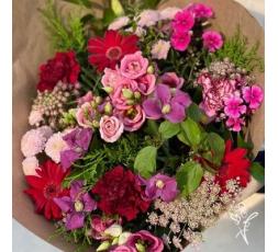 Bouquet de roses, gerberas et astrantias Ce bouquet doux et élégant est composé de boutons de roses tendres, de gerberas et d'astrantias. Les...