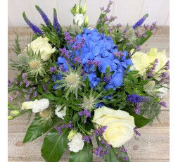 Bouquet composé d'hortensia, roses, lisianthus,chardons bleus. Un arrangement floral qui symbolise la douceur et la force.