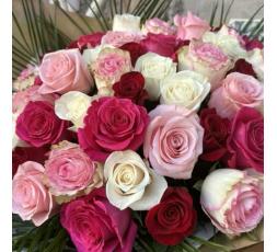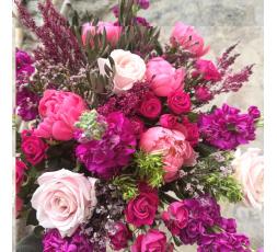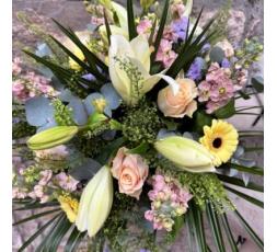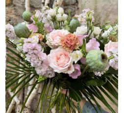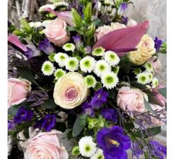 Bouquet composé de roses, lysianthus,eucalyptus,feuillages. Une superbe création florale moderne et pleine de tendresse..