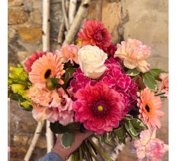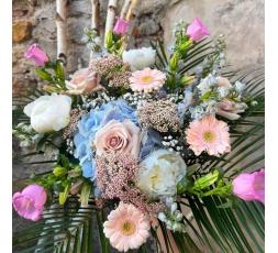 Bouquet de roses, gerberas et astrantias Ce bouquet doux et élégant est composé de boutons de roses tendres, de gerberas et d'astrantias. Les...
