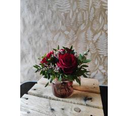 " Joli bouquet composé de 3 ROSES rouge agrémentées de fleurettes de couleur rose ainsi que de son feuillage. le tout disposé dans un vase légèrement coloré".