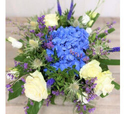 Bouquet composé d'hortensia, roses, lisianthus,chardons bleus. Un arrangement floral qui symbolise la douceur et la force.