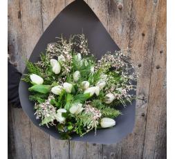 Bouquet de fleurs Cocon de Noël, composé de tulipes, de genêts blanc et de branches de conifères.