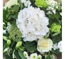 HORTENSE, superbe bouquet avec une belle fleurs d'hortensia et des fleurs de saison dans les tons blancs et verts.