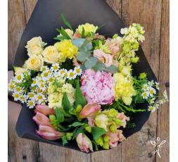 Ce bouquet pastel offre un panaché de couleurs. Pivoines, Camomilles, Alstromerias sauront vous ravir avec ce magnifique bouquet de fleurs. Certains végétaux peuvent varier selon les arrivages.