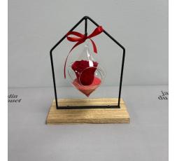 Rose éternelle rouge sous bulle de verre suspendue avec ruban et sable rouge, sur base bois.