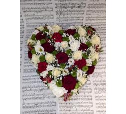 Composition de deuil en forme de cœur, élégamment réalisée avec des fleurs blanches et rouges, symbole d’amour et de respect. Les roses rouges expriment la passion et la tendresse, tandis que les oeillets rouges représentent l'amour pur. Une création sobre et émotive, idéale pour rendre un dernier hommage sincère.