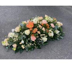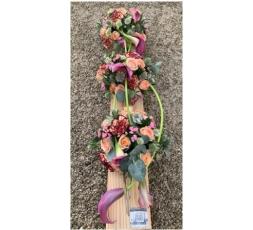 Fleurs principales : œillets, dahlias, germinis, fleurs blanches aériennes, eucalyptus