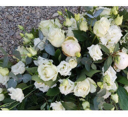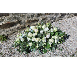 Composition de deuil allongée, tout en délicatesse avec ses fleurs blanches. (environ 80-90cm)