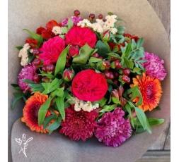 Carla, bouquet fleurs de saison aux couleurs pétillantes. Les roses, les oeillets, les gerberas et les alstroemerias sont à l'honneur dans cette belle création de fleurs fraîches.