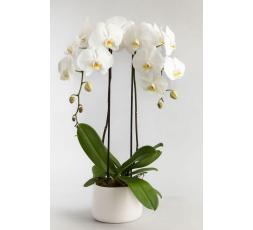 Orchidée blanche (Phalaenopsis) et cache-pot en céramique blanc ou écru (selon stock disponible).