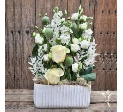 MATHILDE, magnifique composition de roses blanches dans un contenant élégant. une création dans les tons blancs et verts.