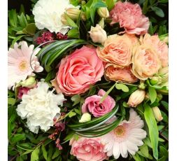 bouquet de fleurs de saison aux teintes roses. Cette création florale est composée de roses, de gerberas et de son feuillage. Un bouquet tout en douceur