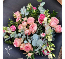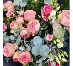 Roses, Eucalyptus, lisianthus blanc