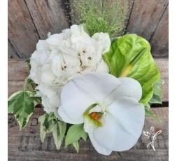 NOE, Jolie composition composée d'un fleuron d'orchidée, d'un hortensia et d'un anthurium. Une création élégante dans les tons blancs et verts.