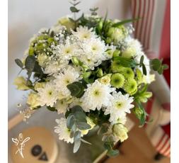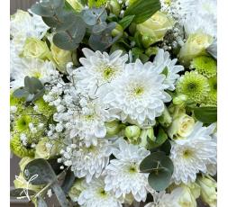 Ce bouquet élégant est composé de boutons de roses blanches, de fleurs dans les tons blancs et verts. Les fleurs blanches, notamment les chrysanthèmes, mettent en valeur le bouquet et apportent du volume et de la tenue.