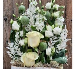 MATHILDE, magnifique composition de roses blanches dans un contenant élégant. une création dans les tons blancs et verts.