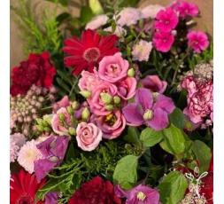 CLEMENCE magnifique bouquet fleurs de saison aux couleurs éclatantes. Les lisianthus roses et les gerberas sont à l'honneur dans cette belle création.