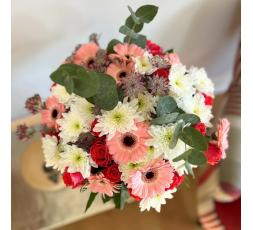 Commandez ce magnifique bouquet de fleurs dans les tons roses pour toutes les occasions et aussi les fêtes de fin d'année (Noël, réveillon, ...). Cette création florale est composée de gerberas, d'astransia, de roses roses et de son feuillage. Un bouquet tout en douceur.