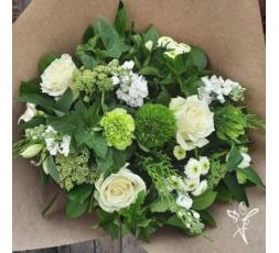 INES, superbe bouquet de fleurs de saison dans les tons blancs et verts. Les roses blanches donneront à ce bouquet l'élégance qui le caractérise.