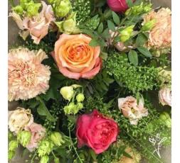 SIMON, bouquet fleurs de saison aux couleurs douces et joyeuses. Les lisianthus, les roses et les œillets sont à l'honneur dans cette belle création de fleurs fraîches.
