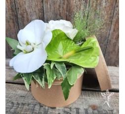 NOE, Jolie composition composée d'un fleuron d'orchidée, d'un hortensia et d'un anthurium. Une création élégante dans les tons blancs et verts.