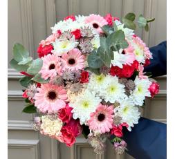 Commandez ce magnifique bouquet de fleurs dans les tons roses pour toutes les occasions et aussi les fêtes de fin d'année (Noël, réveillon, ...). Cette création florale est composée de gerberas, d'astransia, de roses roses et de son feuillage. Un bouquet tout en douceur.