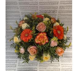 Bouquet composé de roses, craspédias, gerberas,feuillages. Un rayon de soleil pour cet belle création florale.