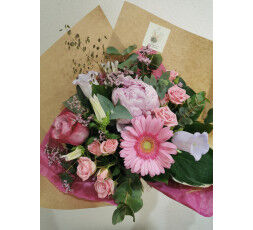 Mélange de fleurs de saison rose, pivoine, limonium, gerbera et autres. Bouquet de forme arrondie. Les végétaux peuvent être remplacer suivant les...