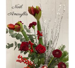 Majestueux : L'amaryllis saura vous séduire dans ce magnifique bouquet composé également de roses rouges et d'eucalyptus.