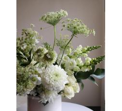 CAMILLE, magnifique composition de roses blanches dans son pot en zinc toute en hauteur et en élégance. une création dans les tons blancs et verts.