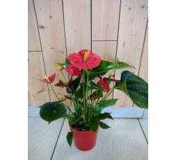 Un bel anthurium rouge avec un son cache-pot, idéal pour une pièce lumineuse. Cette plante demande un entretien minimal : un verre (à moutarde)...