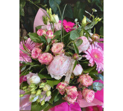Bouquet de roses, gerberas et astrantias Ce bouquet doux et élégant est composé de boutons de roses tendres, de gerberas et d'astrantias. Les...