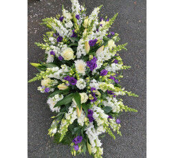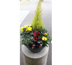 Assemblage de deuil aux couleurs variées composé de plantes fleuries et complété de beaux végétaux.