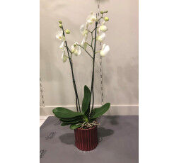 Orchidée deux branches et son cache-pot assorti. Hauteur 70-75cm environ. Arroser une fois par semaine.