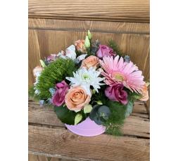 Ravissante composition de fleurs coupées aux couleurs tendres.