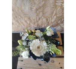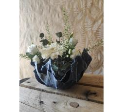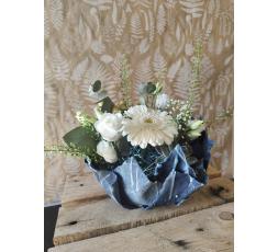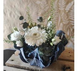 composition florale dans un contenant totalement éco-responsable créer en boutique a partir de tissus recyclés. les couleurs peuvent variés suivant les tissus, les fleurs s'adapterons suivant la couleur du contenant. environ 25/30 cm de diamètre.