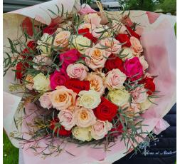 Bouquet de roses couleurs variées. Une généreuse brassée de fleurs et de couleurs.