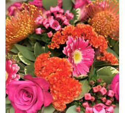 Magnifique bouquet de fleurs variées dans les tons de rose et orange.