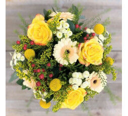 Bouquet composé de roses, craspédias, gerberas,feuillages. Un rayon de soleil pour cet belle création florale.