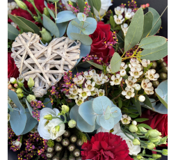 Bouquet composé de roses, lysianthus,eucalyptus,feuillages. Une superbe création florale moderne et pleine de tendresse..