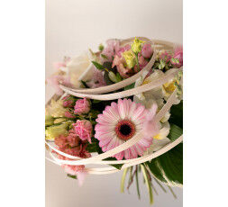 Bouquet arrondi de lisianthus, alstromerias , roses, germini, limonium, eucalyptus comprenant une légère structure en rotin blanc , elle apporte du graphisme et de l'originalité à l'ensemble.
