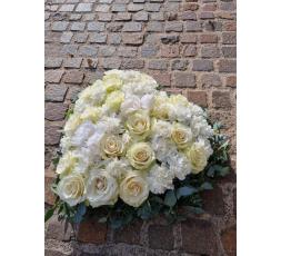 Composition piquée composée de Roses blanches et d'Oeillets blancs, en forme de coeur.