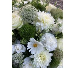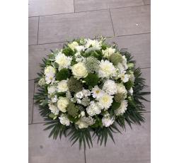 Superbe coussin de deuil composé de fleurs de saison dans les tons blancs et verts.
