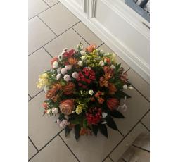 Superbe coussin / gerbe de deuil composée de fleurs de saison dans les tons éclatants rouges orange jaune.