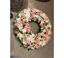 Couronne pour le deuil composée de fleurs de saison, dans des teintes que vous choisissez