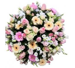 Superbe coussin / gerbe de deuil composée de fleurs de saison dans un ton pastel.