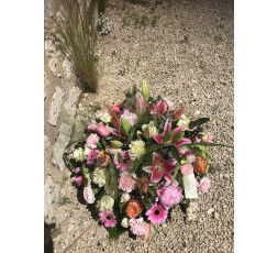 Ce coussin rond est de belle taille (env 60 cm de diamètre). De très bel effet grâce à son volume et ses tons roses contrastée de orange pâle il est un superbe témoignage du souvenir.