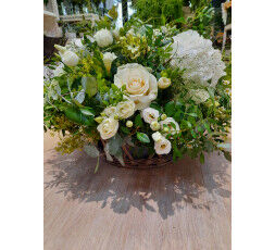 Coussin rond de fleurs de saison dans les tons blanc et vert.