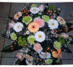 Superbe coussin / gerbe de deuil composée de fleurs de saison dans un ton pastel.